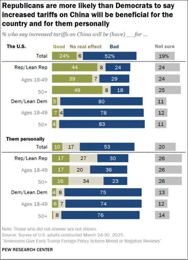 皮尤研究中心发现,尽管他们的调查在特朗普4月2日对中国商品再加征34%的额外关税之前进行,受访者在回答时仅考虑了特朗普此前对所有中国商品征收的两轮各10%的关税。就这20%的关税来说,美国人对特朗普关税更多持负面看法,认为对中国征收关税对美国不利的人比认为此举有利的人多得多,认为对华提高关税会给他们个人带来不利影响的人约是认为这对他们有利的人的五倍。